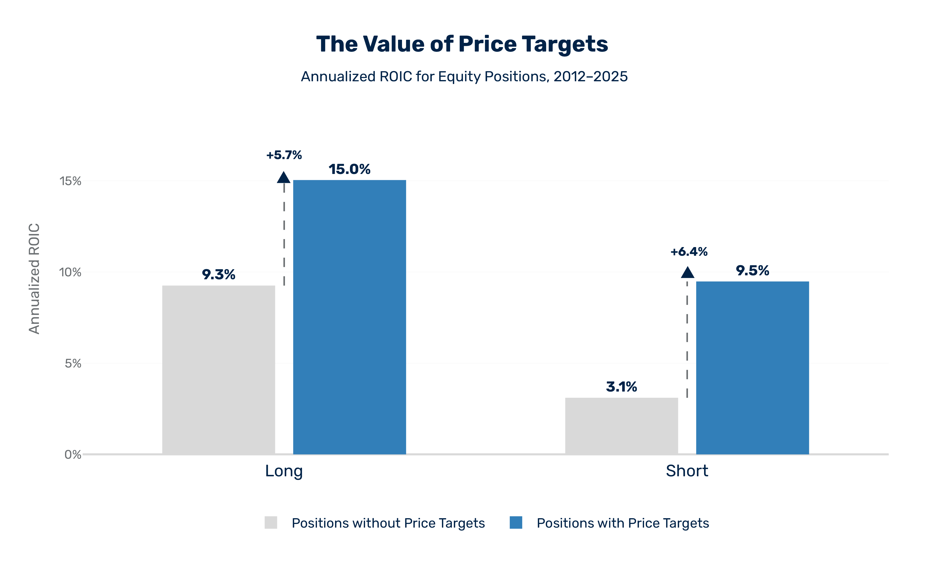 On a ROIC basis, long equity positions with price targets deliver returns 5.7% higher than those without. On the short side, the effect is even larger: positions with price targets outperform by 6.4%.